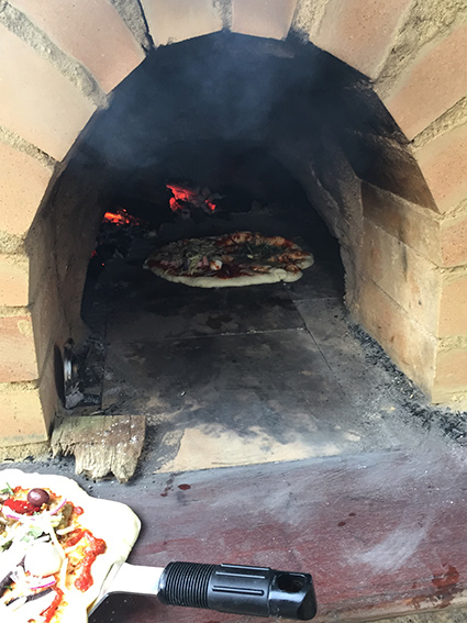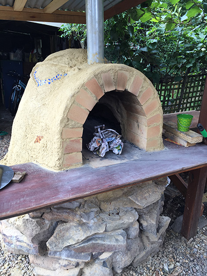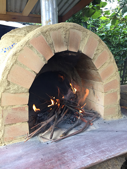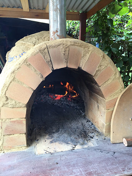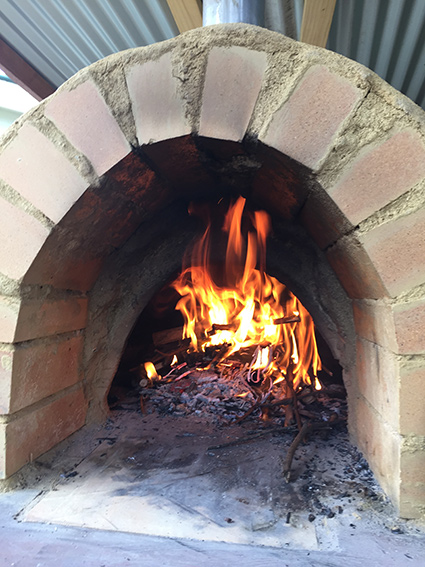 5. Then when that’s fully established push it further back in the oven and keep it firing and stoked for 2 -3 hours.  By which time you will have a very hot oven, some red and white coals and it will be ready to push back right to the back and side. (The side because it give your oven floor more room for pizzas!).    Using a fireproof brush clean up your oven floor as much as possible to take your pizza (or what ever you are cooking)