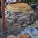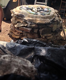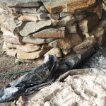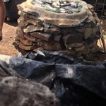 Build your plinth or base out of anything you want. (see previous steps) In our case we found a lot of boulders from around the area, old construction sites etc. We threw in old concrete, rocks, sand in the middle to fill it in and create a better thermal inside. We even put in a very old fire oven that we had removed from house during renovations. Once it’s full and the sand has been poured in to fill in the gaps you bring it up to a level with sand that you can then create a cob floor and wall to allow wine bottle insulation layer. You can see what we did in the photos below. The wall height should be just a bit higher than a wine bottle/beer bottle lying on it’s side. This is so when it’s filled in with sand you can form a perfectly flat layer of sand for fire bricks to sit on.