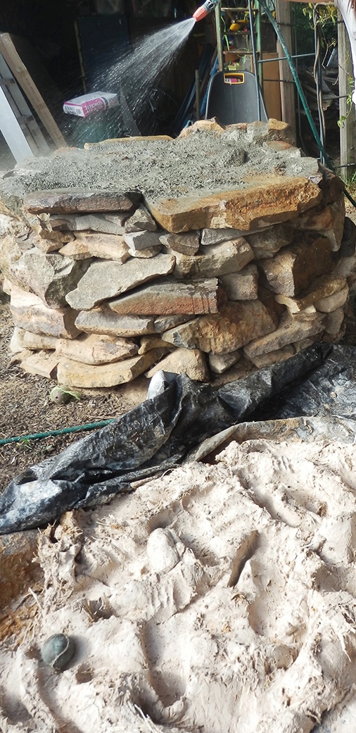 This cob layer will have a small wall built around the outside to just over the height of a wine bottle lying down. But just prior to that we sprinkled some left over concrete on top and wet it down to ensure there was a little bit more integrity and strength to the base. That’s really optional.
