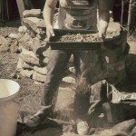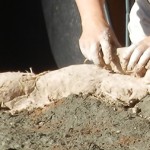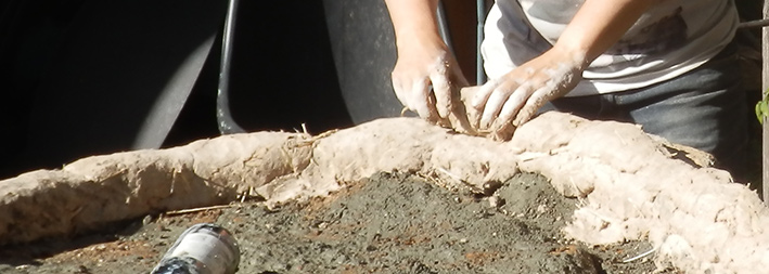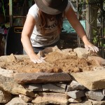 Then we make our first cob mixture! (See the CLAY page to learn how to get clay ready for making cob) We made it with about 2 parts soft clay, 5 parts sand, 2 part straw. What we were doing here is making it structural (straw) and insulated to help the oven floor maintain heat. The next step covers this more thoroughly in pictures.