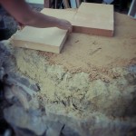 As you lay your firebricks it’s very important to sit them gently on the sand, placed exactly against each other. You almost drop them on and let the slide down the edge of the one beside it. A gentle tap with a rubber mallet to ensure they are completely flush with each other helps too. But don’t stress. This is pretty hard and ours wasn’t perfect. But it was good enough for our Pizza pale to slide right across and eventually the cracks will up with ash etc. As you place them remember where your front door is going to be and think about having a protruding tile or slab coming out a little.