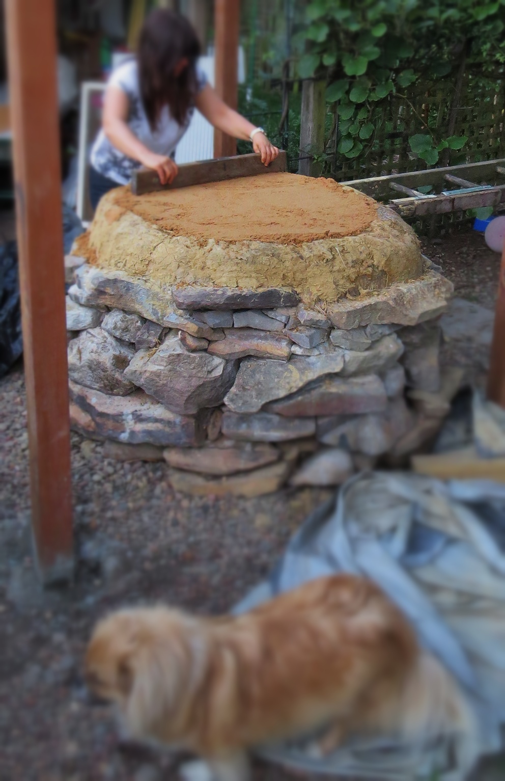 The other thing to keep an eye on is level. Using a piece of wood lying across from one side of the wall to the other – throw a level on there to keep an eye on it. You should be building up the wall so all sides are level – this is the stage where you really do start needing to level it out. Up until this point it’s been pretty organic and done by eye. The firebricks will need to be laid completely level (or very very slightly sloping towards where your door will be to ensure rain is not going to drain into the back of the oven).