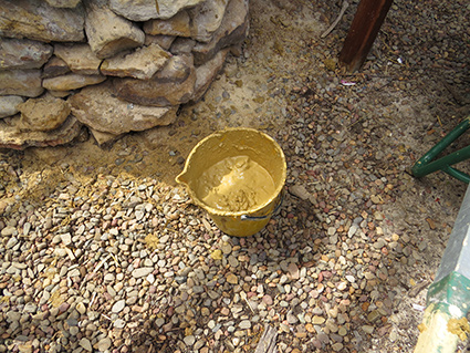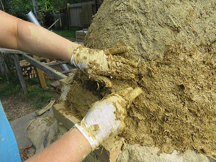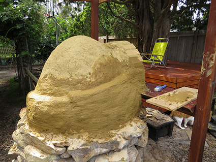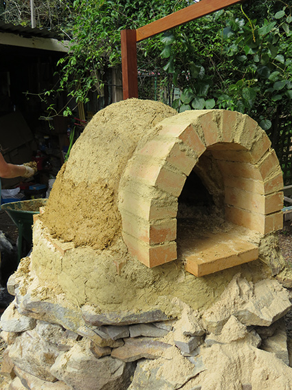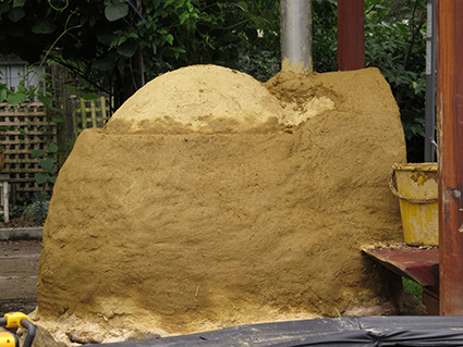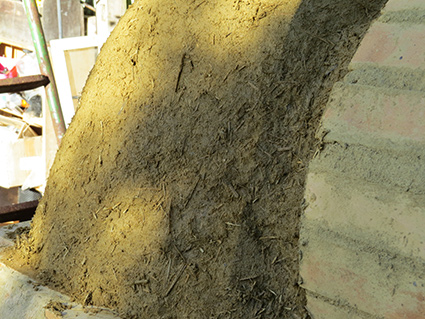The next stages take time. Building up the cob oven layer by layer. These layers have straw added to the mixture. The straw adds strength and insulation to the cob and is very important to add. The amount is hard to say except that it’s a few good handfuls. You can see from the texture about what we did. After each layer we let it dry as much as possible before adding the next layer. We often created a “slip” – a very wet soup like mixture from clay and water – to put on the dry layer prior to adding the next layer to act like a glue.